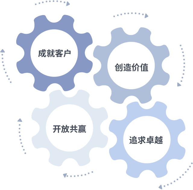 成就客户是一切决策的出发点,,,,创造价值是衡量所有工作的标准,,追求卓越是我们做事做人的态度,,开放共赢是我们的格局也是最终的结果。。。。价值观的齿轮环环相扣,,,,推动着组织里的每个人不断向前。。。